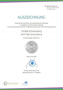 Die Auszeichnung  ist aber auch ein Ansporn für die Zukunft. Die Volksschule Bad Schwanberg wird auch weiterhin intensiv an der digitalen Bildung arbeiten und sich weiterentwickeln. Besonderer Dank gilt dabei Frau Nadine Schwab, unserer Informatiklehrerin.