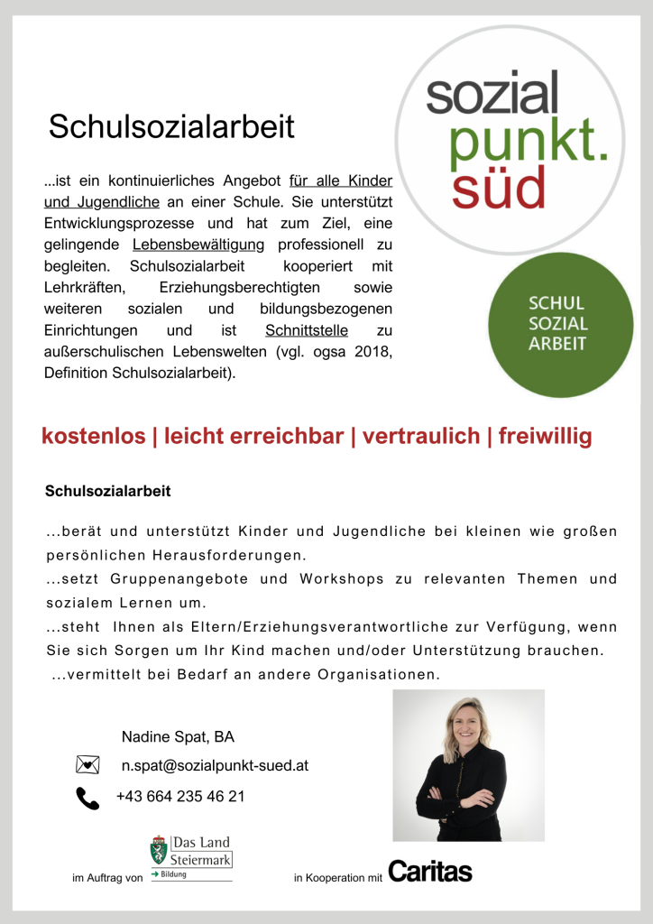 Schulpsychologische Beratungsstellenhttps://www.bildung-stmk.gv.at/service/schulpsychologie/Beratungsstellen-und-Erreichbarkeiten.html SchulsozialarbeitNadine Spat